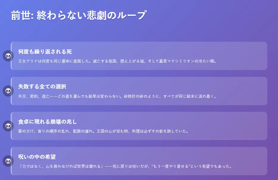 アリナの人生は、何度も同じ場所で途切れてきました。滅亡する祖国。燃え上がる城。最期に見上げるのは、あの男――暴君マクシミリオンの氷のような瞳。